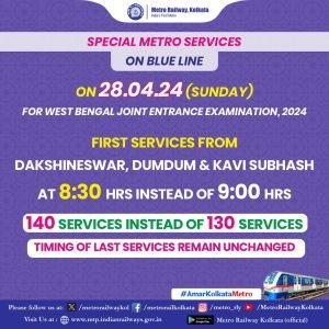পশ্চিমবঙ্গ জয়েন্ট এন্ট্রান্স পরীক্ষা, 2024-এর প্রার্থীদের সুবিধার জন্য,ব্লু লাইনে রবিবার মেট্রো পরিষেবা ৯ টার পরিবর্তে ৮:৩০ টায় শুরু হবে৷ সেই নির্দিষ্ট দিনে এই করিডোরের পুরো অংশে 130টি পরিষেবার পরিবর্তে 140টি পরিষেবা মেট্রো চালানো হবে৷শেষ মেট্রো পাওয়ার টাইম অপরিবর্তিত থাকবে। পরীক্ষার্থীদের সুবিধার কথা মাথায় রেখে এই পদক্ষেপ নেয়া হয়েছে বলে মেট্রো কর্তৃপক্ষের তা থেকে জানানো হয়।